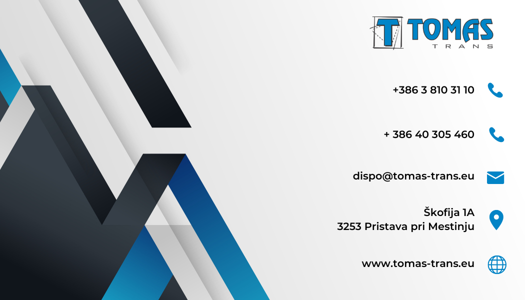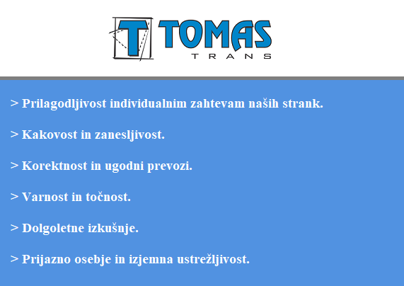 TOMAS TRANS d.o.o., je podjetje z več kot 15 letno tradicijo opravljanja prevozov v mednarodnem in lokalnem cestnem tovornem prometu.